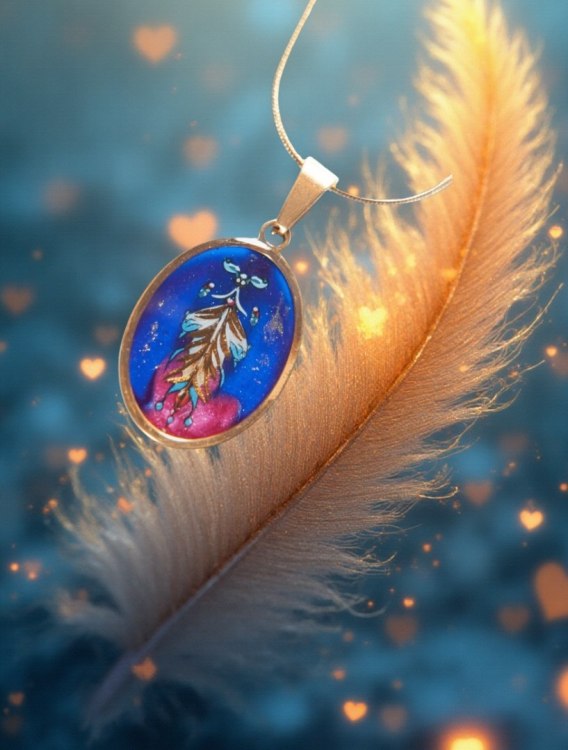 Centralnym motywem jest pióro w kolorystyce biało-złoto-niebieskiej 🪶 - symbol ochrony, intuicji i wolności. Całość delikatnie oprószona jest złotą miką, która tworzy efekt subtelnego brokatu, pięknie odbijającego światło i podkreślającego artystyczny charakter naszyjnika ✨.