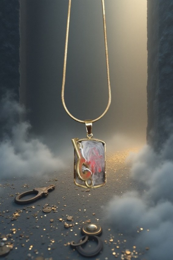 Kolorystyka oparta na czerni, szarościach i bieli tworzy chłodną, spokojną bazę, przełamaną subtelnymi akcentami czerwieni, symbolizującymi emocje, pamięć i impuls. Całość zamknięta jest w niewielkim wisiorku o formie małego portalu, który zaprasza do osobistej interpretacji.