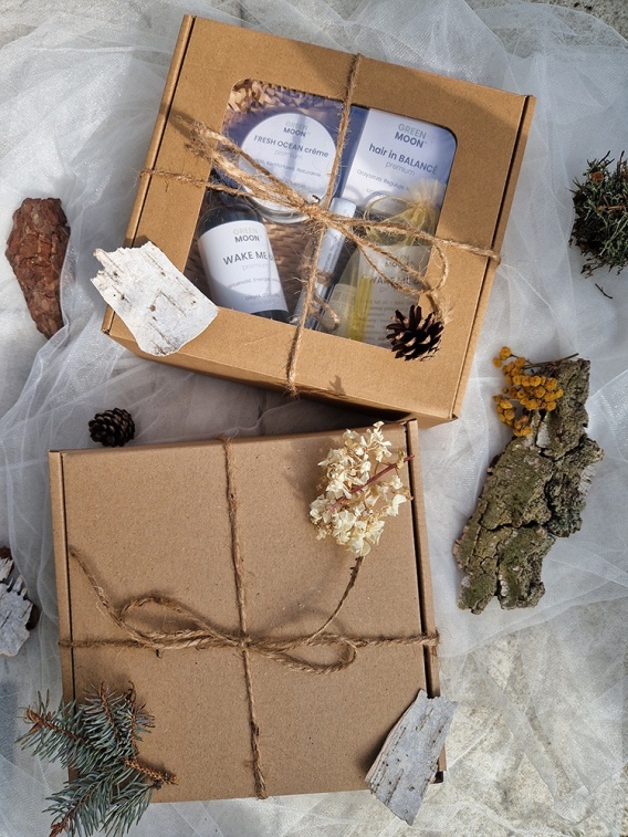 Eleganckie pudełko eco z okienkiem. Pakowanie na prezent GREEN MOON™ – piękne, naturalne i gotowe do wręczenia.