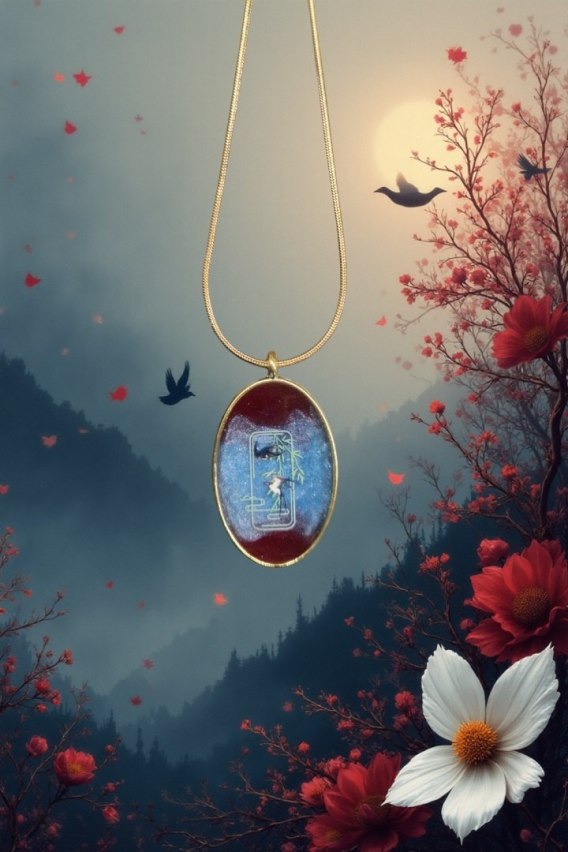 Tło naszyjnika płynnie przechodzi od głębokiej czerwieni na górze i dole 🔥 do chłodnego błękitu w centrum ❄️, tworząc efekt mgły, przejścia dnia w noc lub światła w cieniu — jak japoński pejzaż o świcie. Kompozycja jest wyjątkowo malarska, lekko magiczna, nastrojowa.