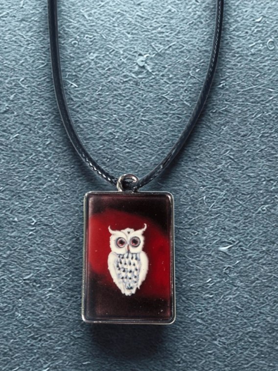 Artystyczny naszyjnik z białą sową na intensywnym, czerwono-czarnym tle 🦉🌑 Prostokątny wisior na czarnym rzemyku - symbol czujności, ochrony i nocnej intuicji.