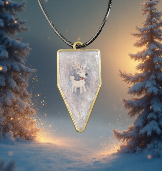 Dwustronny medalion z kolekcji Zwierzęta z motywem białego renifera. 🦌 Subtelna, jasna kompozycja z delikatnym połyskiem tworzy spokojny, zimowy klimat. ✨ Zawieszony na rzemyku z czarnej eko skóry - wygodny i lekki w noszeniu. 🖤 Unikatowa biżuteria tworzona ręcznie. 🌙