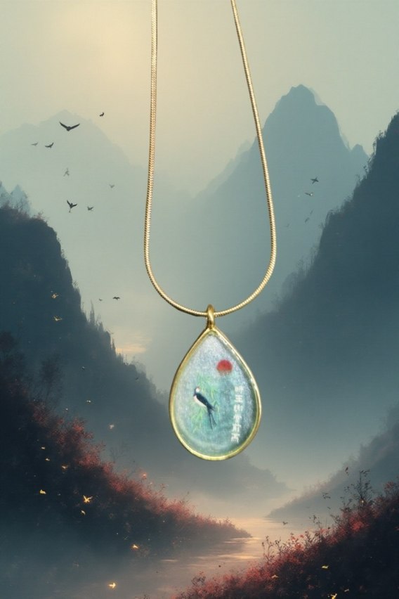 Pozłacany naszyjnik 💧 w morskich odcieniach z ptakiem, czerwonym księżycem i japońskimi znakami. Rękodzieło — subtelne i wyjątkowe.