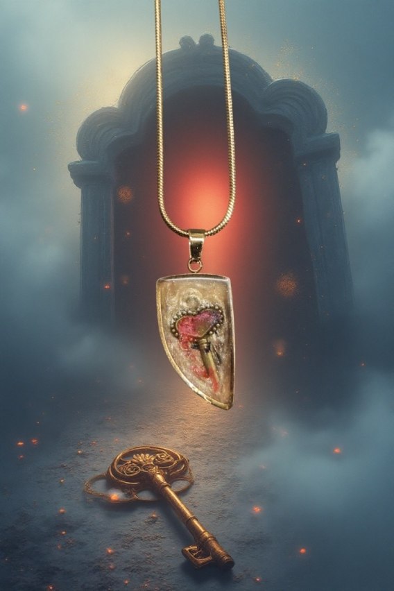 Różowo-czerwony akcent podkreśla emocjonalny wymiar formy — odnosi się do uczuć, pamięci i wewnętrznych przejść. Złote drobiny i ciemniejsza baza tworzą wrażenie głębi, jakby wisior był małym portalem, prowadzącym do osobistej historii.