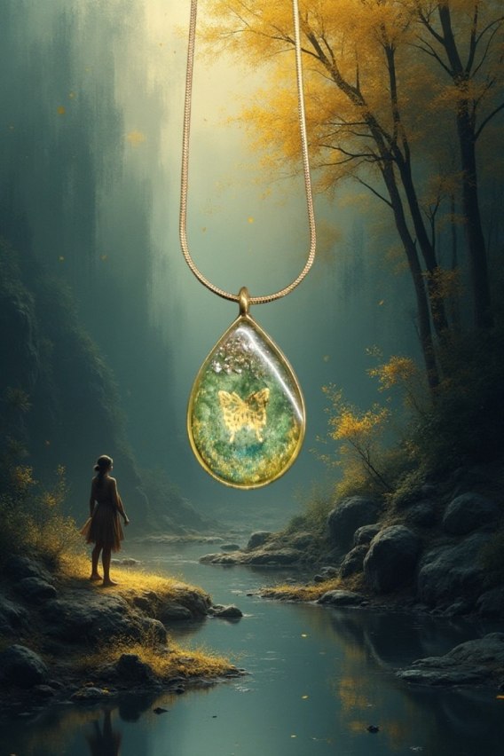 Medalion w kształcie łezki wypełniony jest zielonym tłem, wzbogaconym drobinkami złota, które nadają całości świeżości i naturalnej energii 🌿. W kompozycji pojawiają się również srebrne akcenty oraz złota mika, subtelnie odbijające światło i podkreślające artystyczny charakter biżuterii.