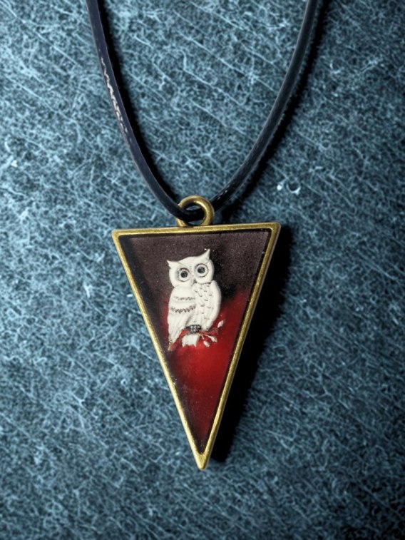 Artystyczny naszyjnik z motywem białej sowy na głębokim czerwono-grafitowym tle 🦉🌑 Wisior w kształcie trójkąta, zawieszony na czarnym rzemyku - symbol czujności, intuicji i wewnętrznej siły.